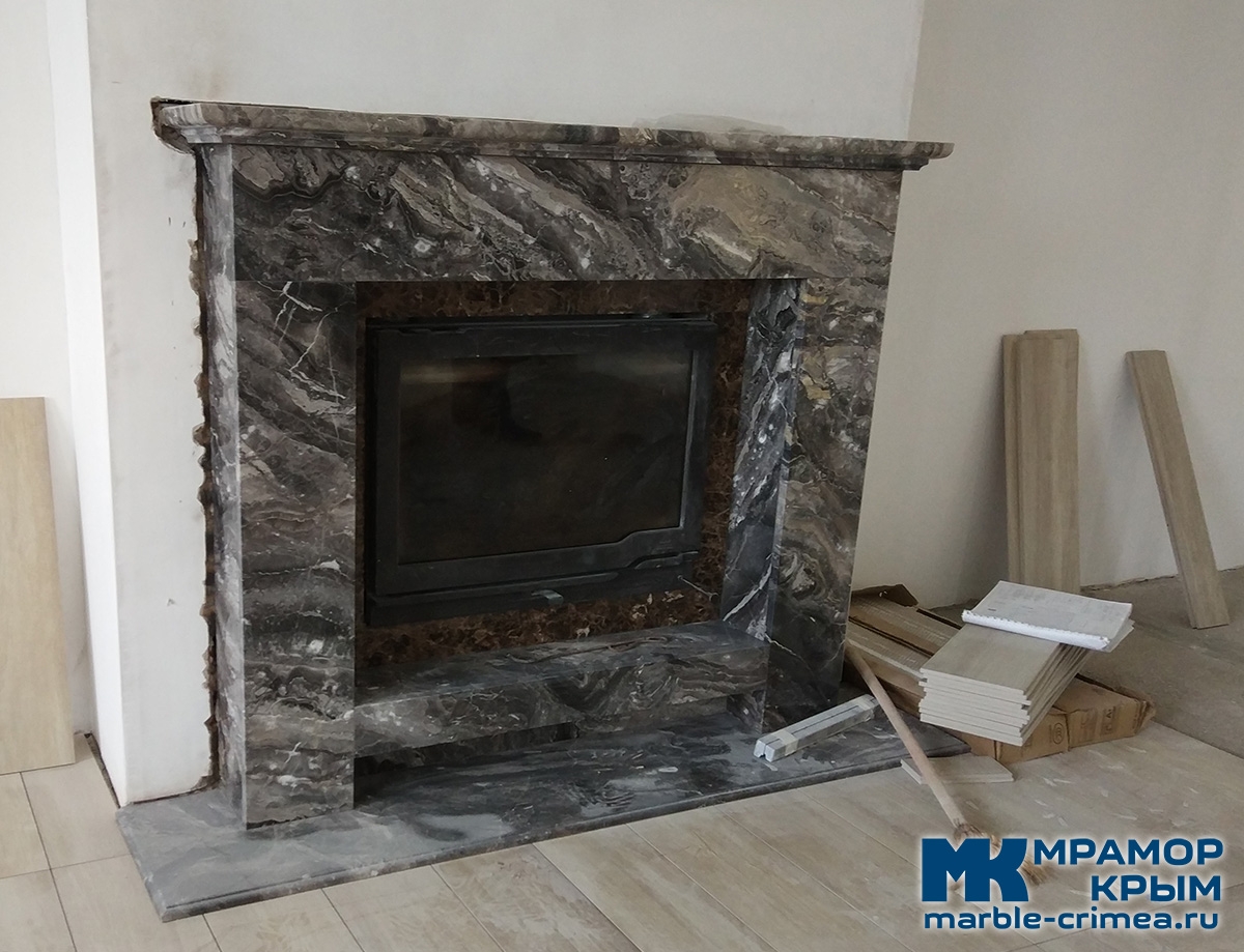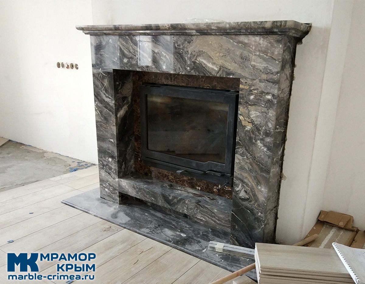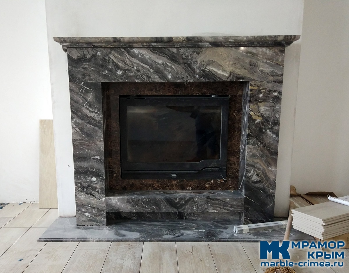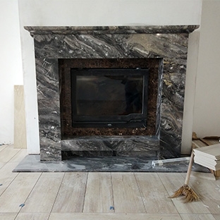 Два вида камня. Примыкание к топке из темно-коричневого мрамора Emperador Dark (Турция).