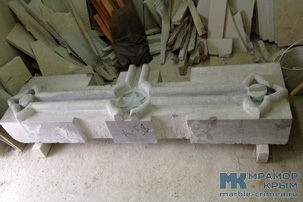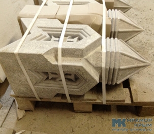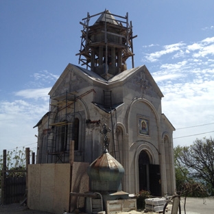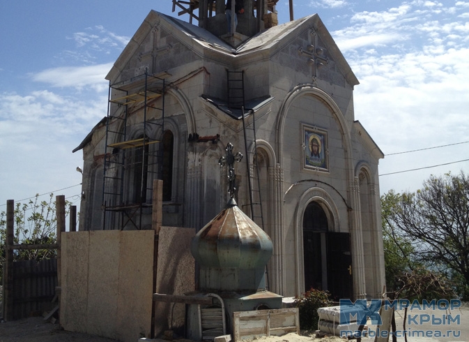 Проект реставрации церкви из натурального камня. В результате различных исторических событий, были уничтожены один из фасадов, фронтоны и звонница. Материал - крымский мраморовидный известняк. Фасадные блоки камня также являются частью несущей конструкции. Поверхность деталей обработана плоским и игольчатым бучардированием.
