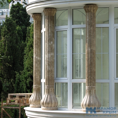 Декоративная облицовка несущих колонн. На каждом из этажей колонны определенного вида. Стиль - модерн. Материал - натуральный мрамор Emperador Light. Высота изделий - 2800мм.
