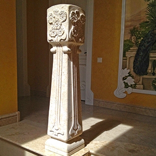 Наверно модерн можно назвать стилем несогласных, бунтарей что ли. Один удар бича Гауди чего только стоит. Свободный, легкий, немного своенравный и элегантный. В добавок мрамор наверное не самый лучший материал для объемных форм в стиле модерн. По своей натуре мрамор - материал, требующий четких, определенных форм. Поэтому в нашем проекте колонн из камня мы использовали детритовый известняк. Это материал как нельзя лучше передал замысел художника. Не перетянул фактурной камня на себя акцент с формы колонны. В целом данный материал может использоваться не только для проектов в стиле модерн. В интерьерах стиля кантри, хайтек, прованс известняк тоже очень органично вписывается.