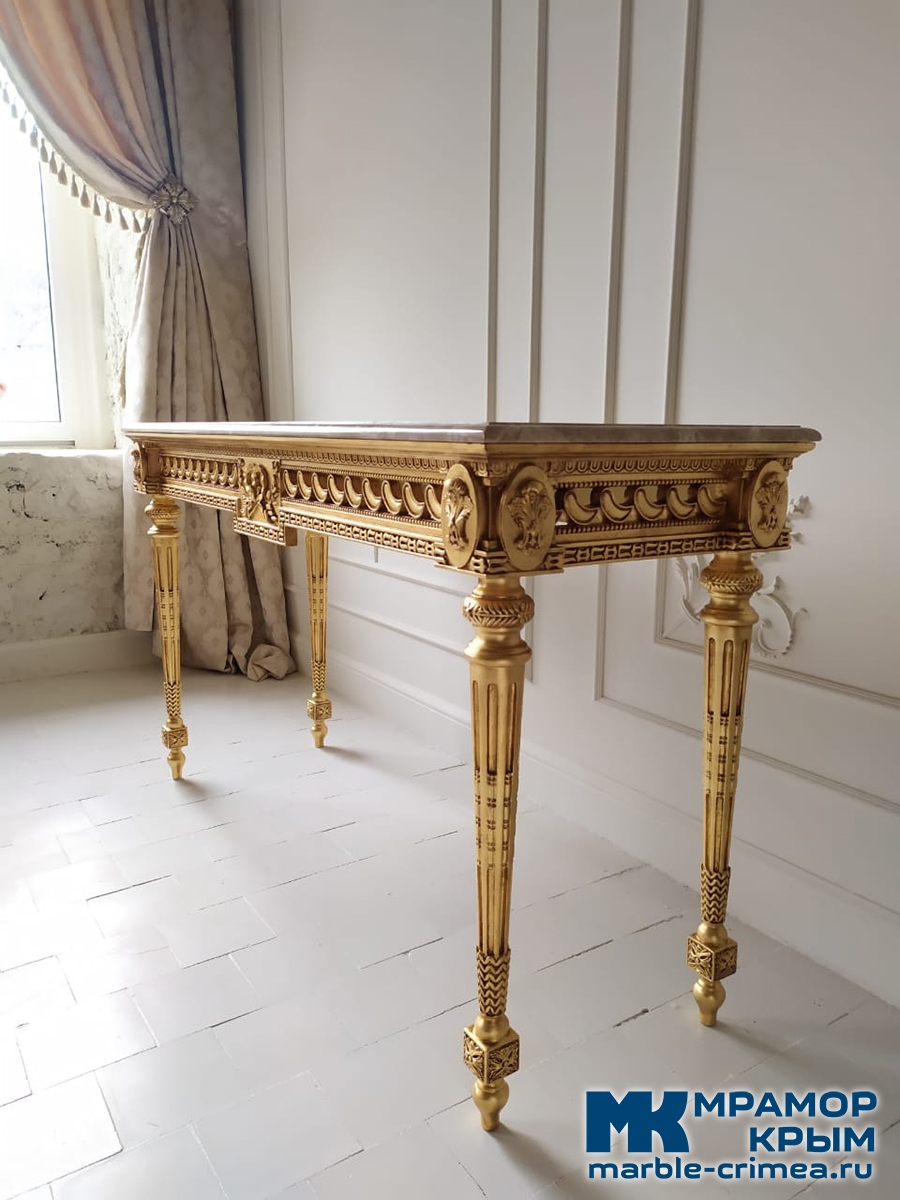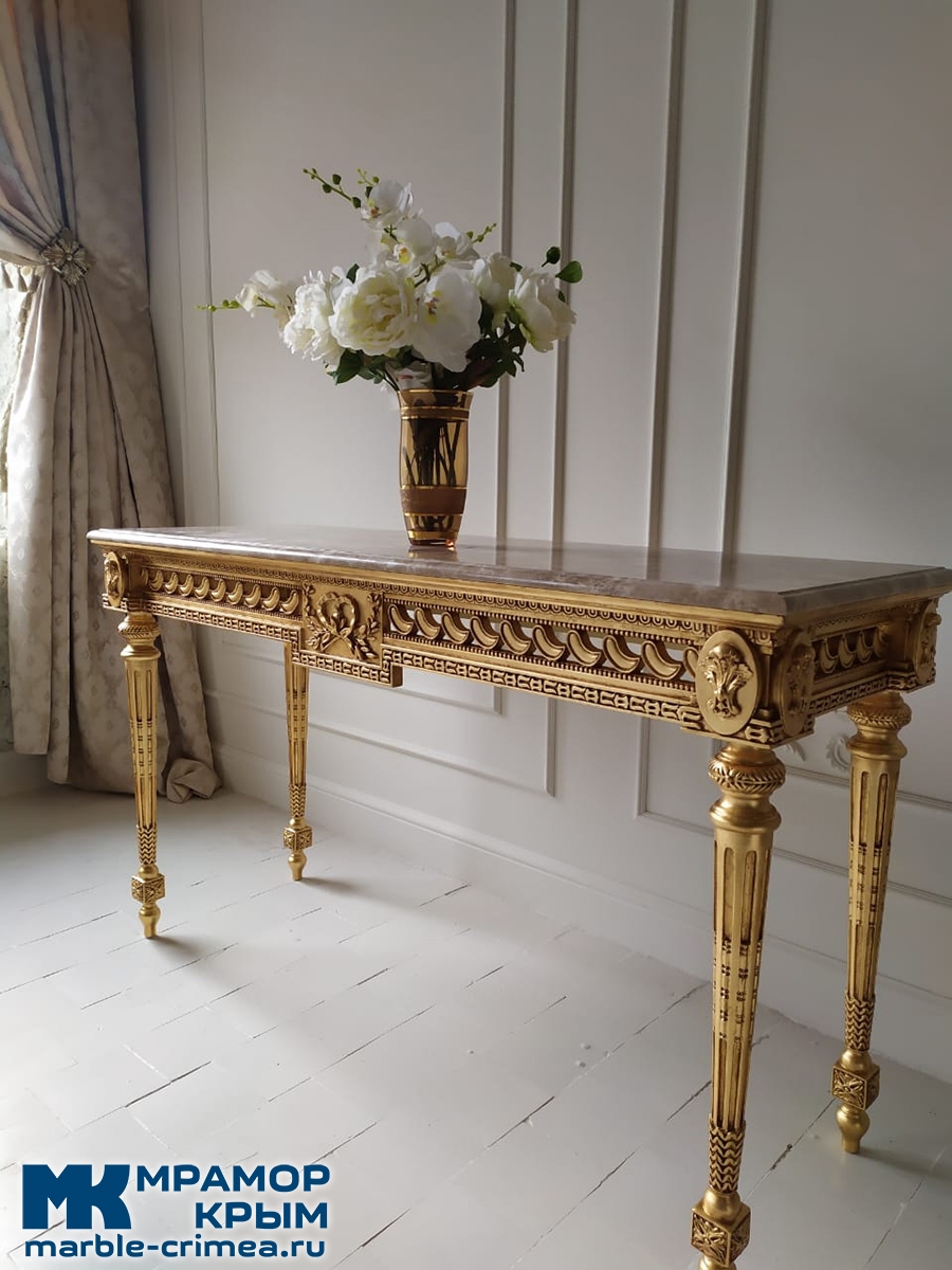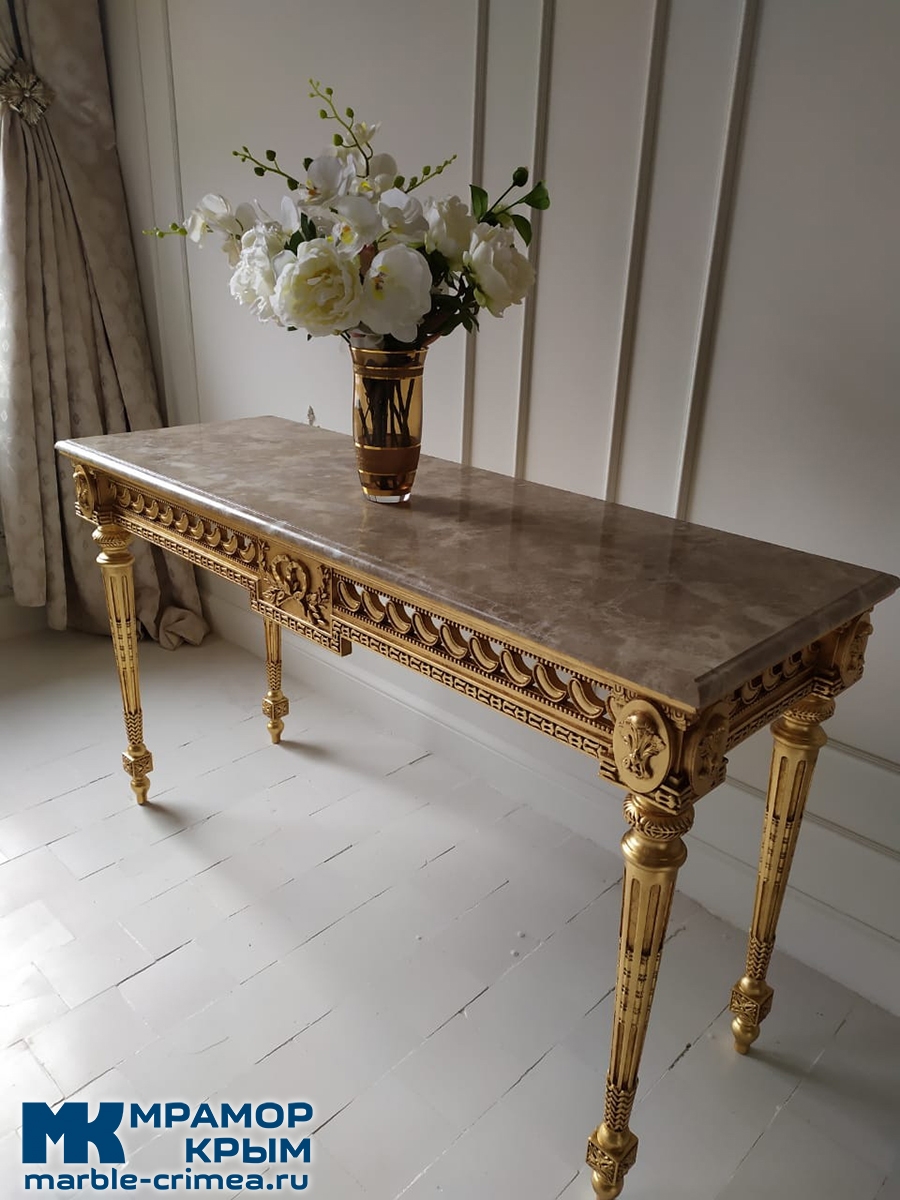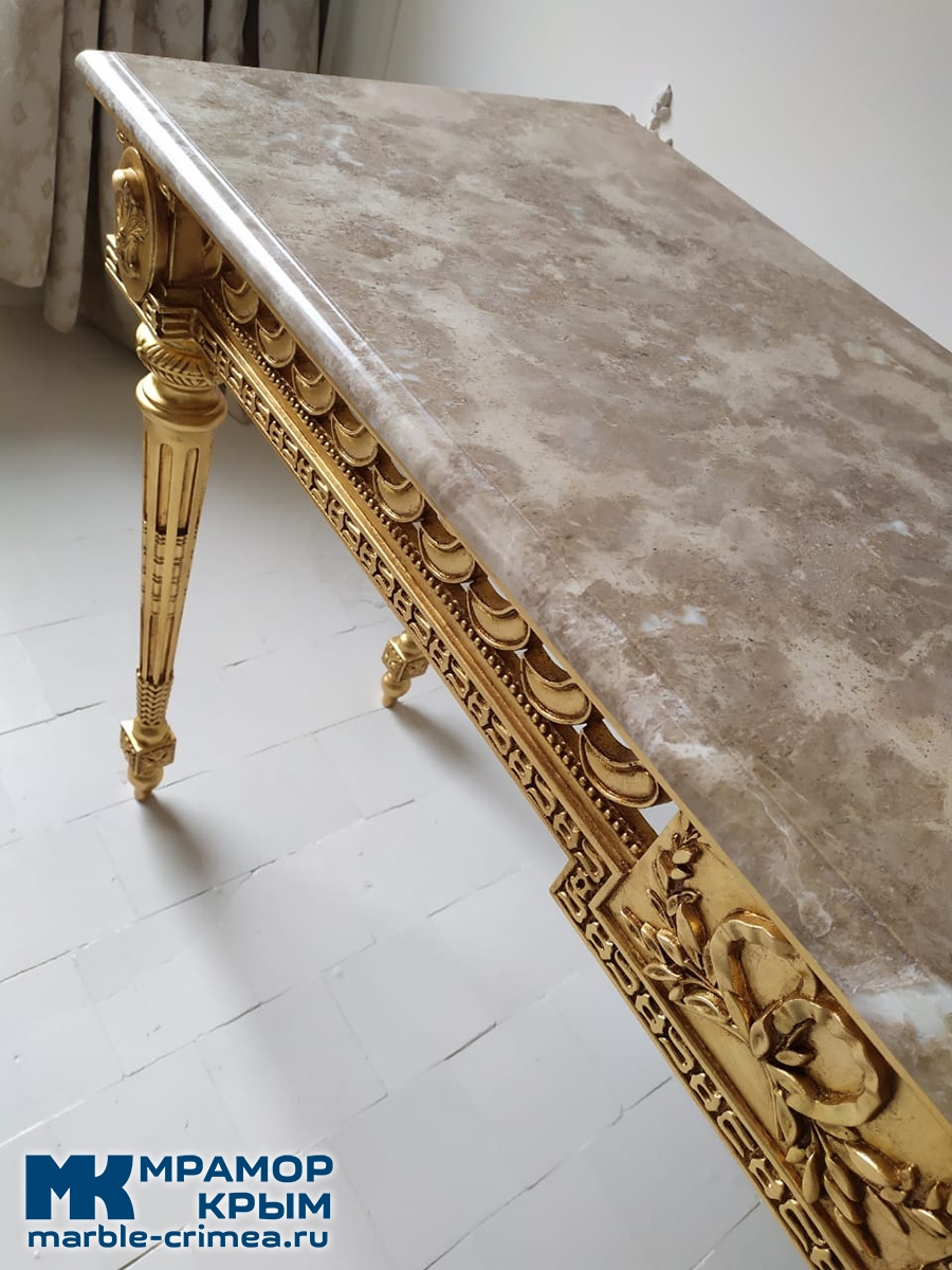 Существует множество вариантов оформления лицевой поверхности для столов. В случае с резными декоративными столиками мы видим только один приемлемый вариант - мрамор.