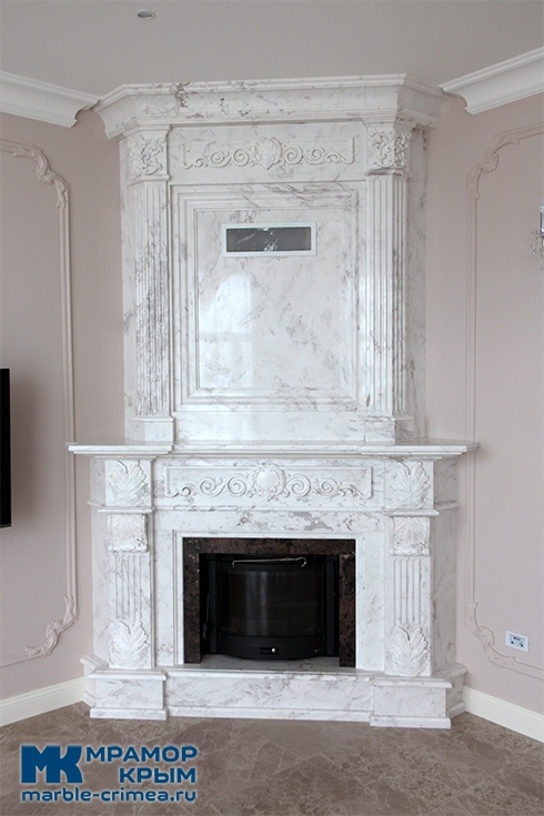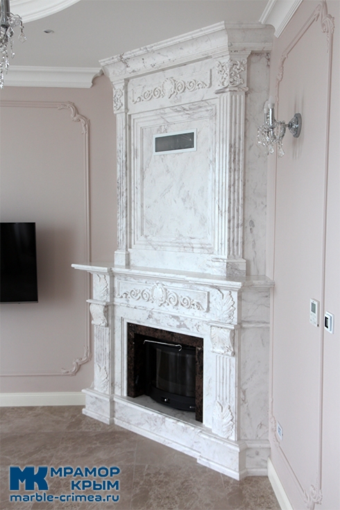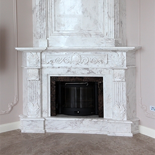 Мраморный камин в неоклассическом стиле. В дизайне огромное количество направлений. Каждое по своему интересно и какое из них наиболее предпочтительно однозначного ответа не будет. Часто в интерьере придерживаются не какого-то конкретного стиля, а используют их сочетания, если только выбранные формы не идут в разрез друг с другом. В нашем проекте были заимствованы элементы классики и барокко. Каминный портал - это не столько практическая вещь, сколько эстетическая. Централизованное отопление и технология теплых полов вытеснили твердотопливные печи (камины). Вместе с тем мраморный камин - это один из главных элементов композиции дома. Для облицовки камина часто используют натуральный камень. В нашем проекте - это мрамор Pirgon. Отделка камина камнем процесс творческий. Требования, которые предъявляются к каминному порталу - это выверенные формы, соблюдение технических нюансов , поддержание общей концепции интерьера.