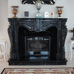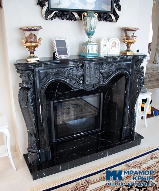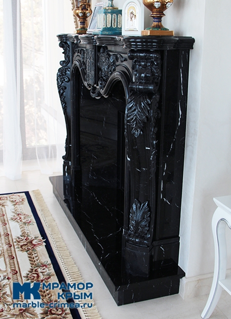 Количество моделей порталов данного стиля огромно, но тем не менее каждая из них будет иметь свои уникальные особенности. В нашем случае это центральный элемент композиции мраморного камина - фамильный герб. А также использование черного мрамора Negro Marquina, что не типично для данного стиля. Визитной карточкой таких каминов из мрамора будут большое количество резьбы в стиле барокко, элегантные изгибы верхней полки, развернутые колонны по углам портала. Основная задача мастера при производстве данной облицовки остаться верным стилю и вместе с тем привести что-то своё!