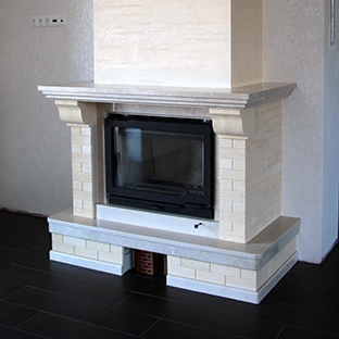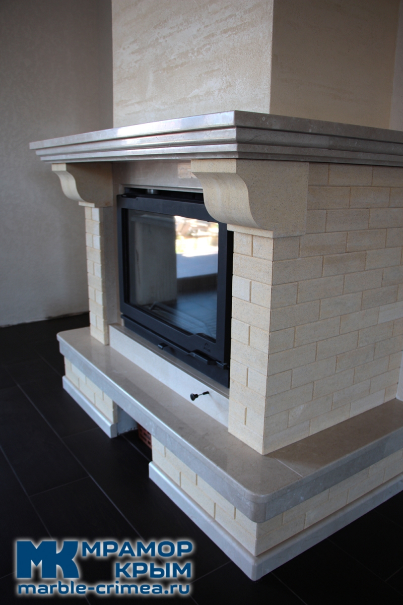 Остальные элементы из крымского детритового известняка. Использование известняка с его матовой поверхностью и теплым оттенком соответствует заданному стилю интерьера. А полированный мрамор на горизонтальных поверхностях облегчает уход за камином.