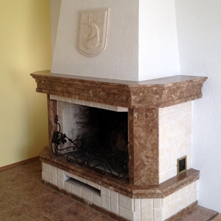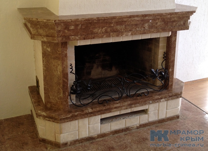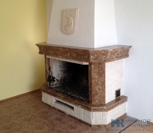 Камин из натурального камня с использованием двух видом материала. Мрамор - Emperador Light и крымский детритовый известняк. Сверху камина фамильный герб. Габаритные размеры камина - 2025 х 1370 х 920 мм. Размеры топки - 1055 х 765 мм.