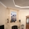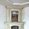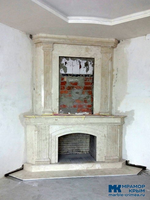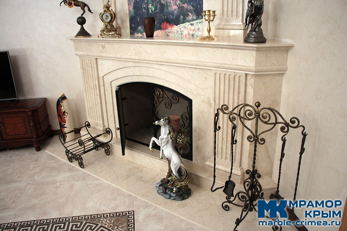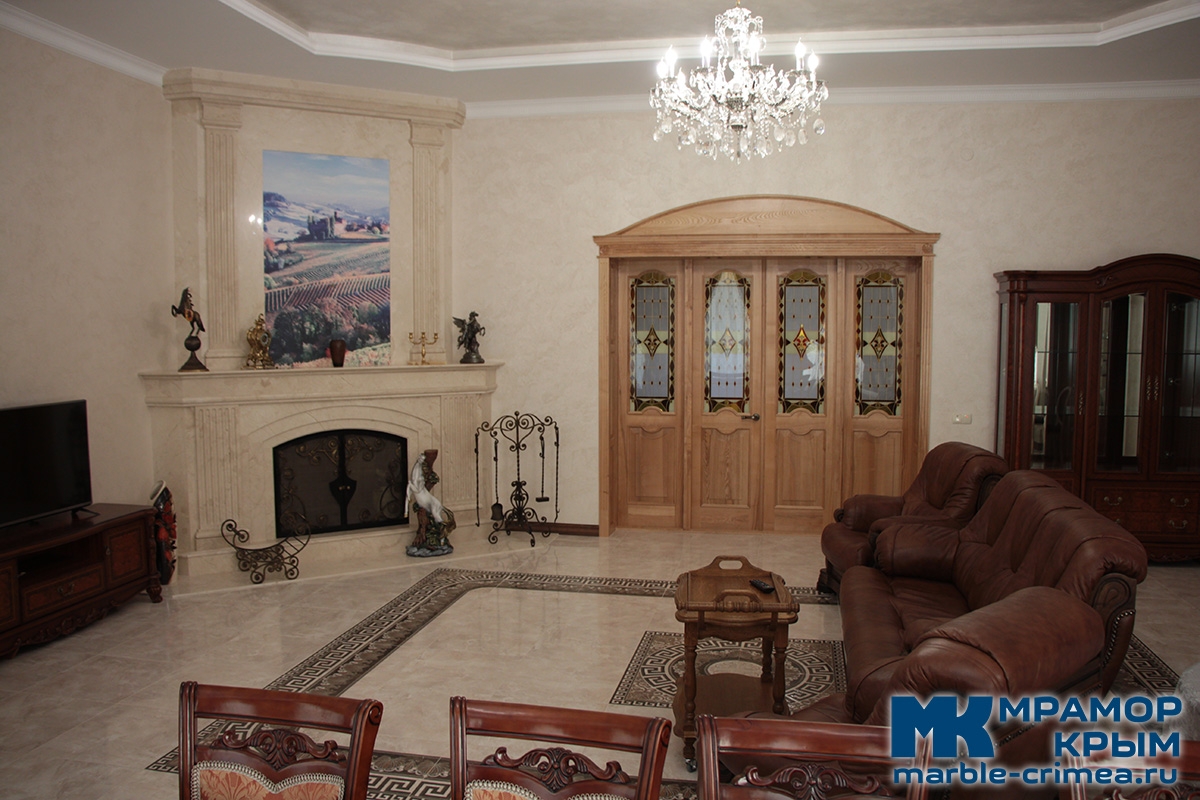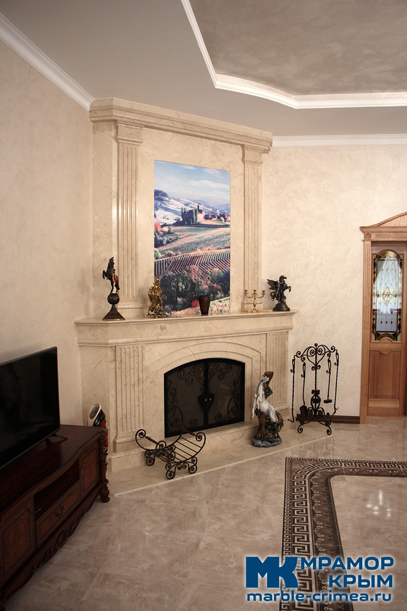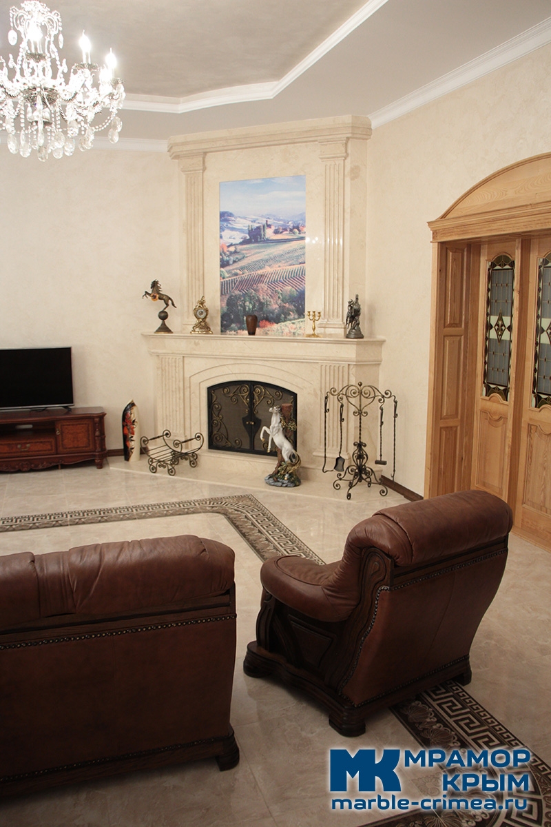 Облицовку камина из мрамора сделали в классическом стиле. Канелюры, прямые формы, архитектурные обломы. Старая, добрая классика. Но как это очень часто бывает, бюджет проекта обрезал крылья художникам. После долгих переговоров было решено заменить центральную часть мраморной облицовки дымохода на фреску. Кто знает, может в далекой перспективе дизайнерский замысел будет реализован в полном объеме.