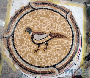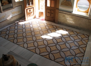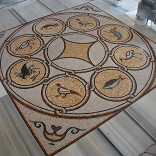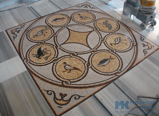 Мраморная византийская мозаика - разновидность мозаичных полов, которая используется уже несколько сотен лет. Именно этот стиль был использован для напольного покрытия в ходе восстановления храма Св. Пантелеймона в Инкермане. В основе были использованы мотивы херсонесской мозаики 5 века н.э., которая частично сохранилась до наших времен и доступна для всех желающих на территории одноименного заповедника.