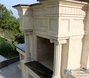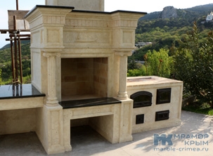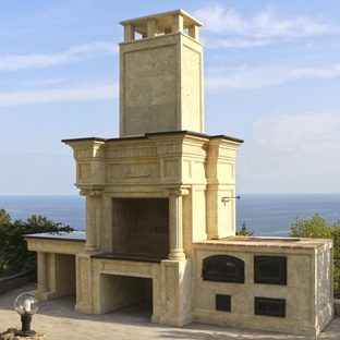Проект облицовки барбекю натуральным камнем. Расположение объекта - Южный Берег Крыма, Ореанда. Стиль - классический. Материалы - новоданиловский гранит для горизонтальных поверхностей и детритовый известняк для остальной облицовки. Фасад барбекю украшает барельеф в виде галеры.