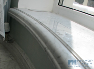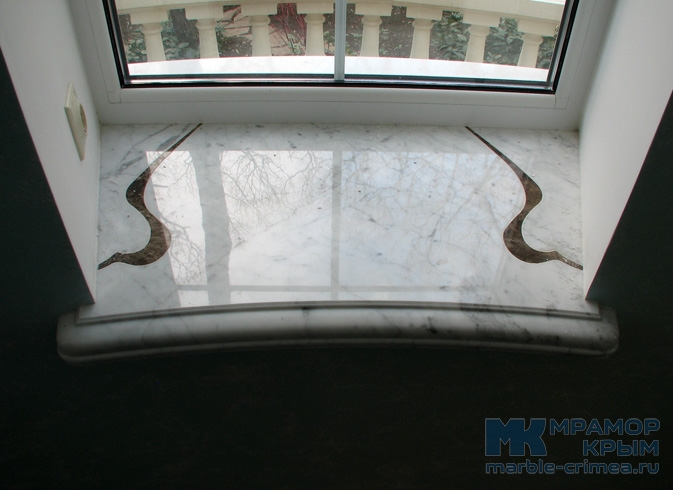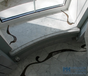 Мраморный подоконник из двух видов мрамора в стиле модерн. Конструкция армированная, самонесущая. Материал - натуральные мрамора Bianco Carrara и Emperador Dark. Толщина подоконника - 60 мм. Цвет мрамора и фаска подоконника могут быть изменены по запросу.