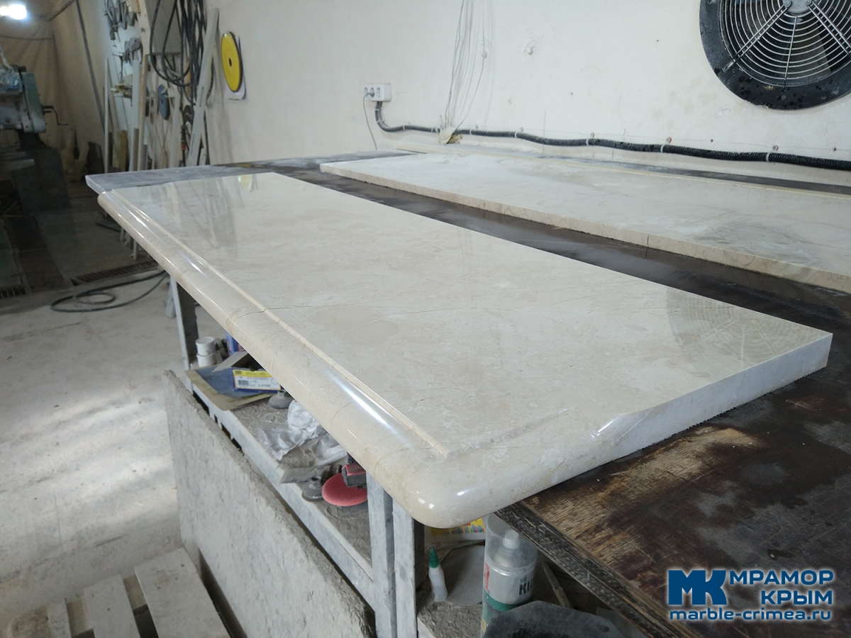 Подоконник из мрамора Crema Mare. Размеры 1260 х 380 х 30 мм. Профиль обработки «Н». Простенько и со вкусом ;)) Кстати размеры, формы фасок и цвета могут быть – ЛЮБЫЕ! Наше оборудование позволяет не ограничиваться стандартными решениями.