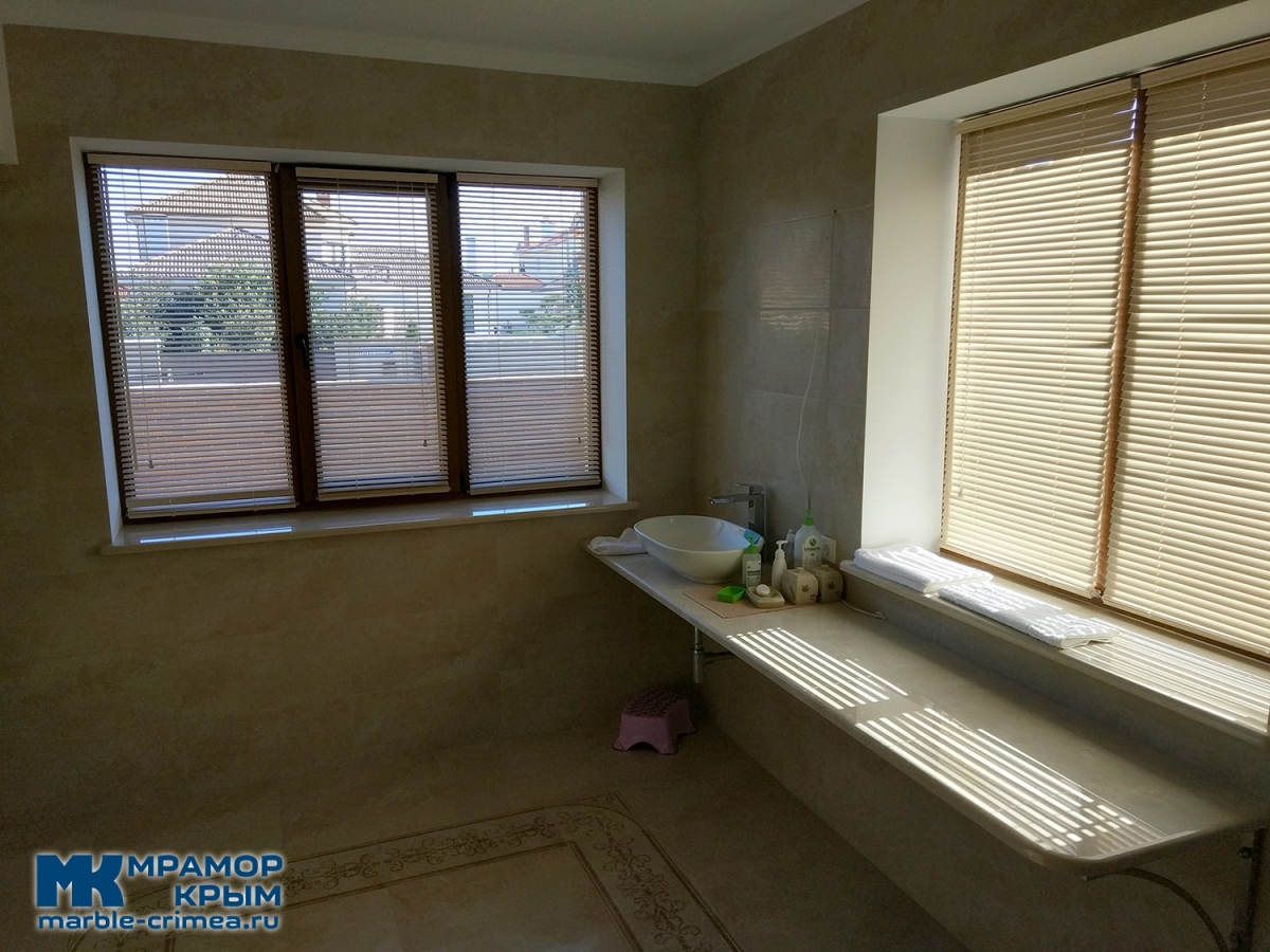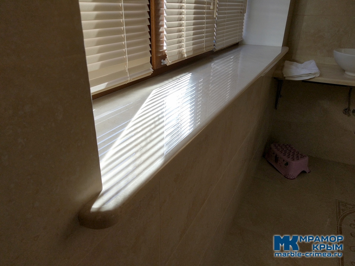 Какое альтернативное решение может быть для помещения с избыточной влажностью и стенами из керамики? Конечно мрамор! Подоконник из мрамора ближе всего к керамограниту по тактильным ощущениям, не имеет ограничений по изготавливаемым формам и не боится влаги.