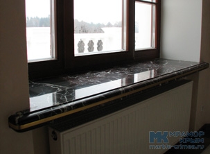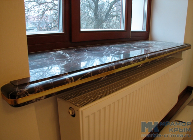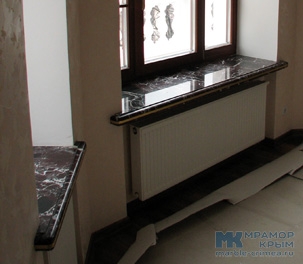 Мраморный подоконник с латунным профилем. Конструкция армированная, самонесущая. Материал - натуральный мрамор Rosso Levanto. Толщина подоконника - 60 мм. Цвет мрамора, форма латунного профиль и фаска подоконника могут быть изменены по запросу.