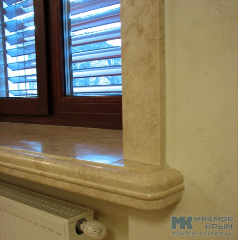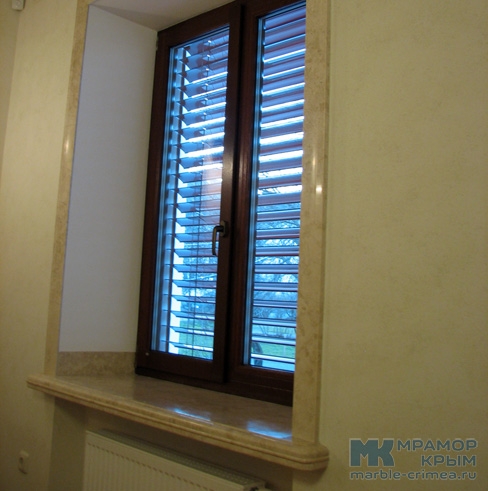 Мраморный подоконник с наличниками на оконный проем. Конструкция армированная, самонесущая. Материал - натуральный мрамор Crema Mare. Толщина подоконника - 60 мм. Нижние части откосов оконного проема также облицованы мрамором для упрощения процесса чистки поверхности. Цвет мрамора и фаска подоконника могут быть изменены по запросу.