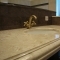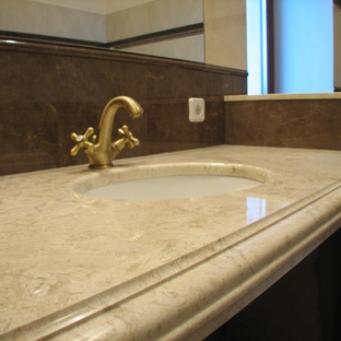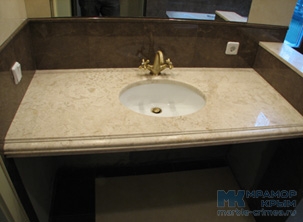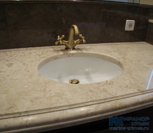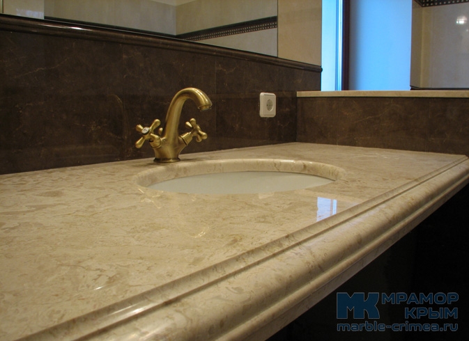 Мраморная столешница из бежевого мрамора с креплением в стену. Материал - мрамор Crema Mare. Толщина 60 мм. Конструкция самонесущая.