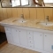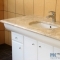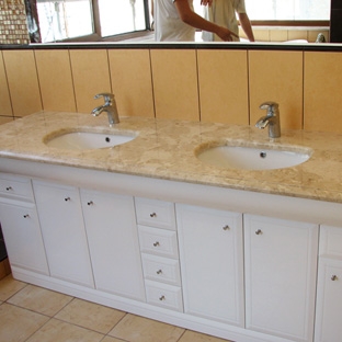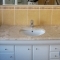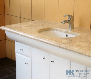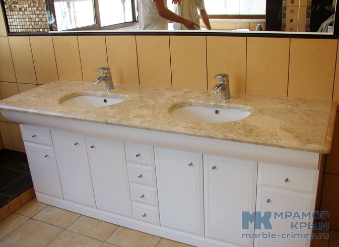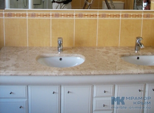 Столешница из бежевого мрамора для двух раковин. Несущей конструкцией является мебель. Материал - мрамор Crema Mare. Толщина 30 мм.