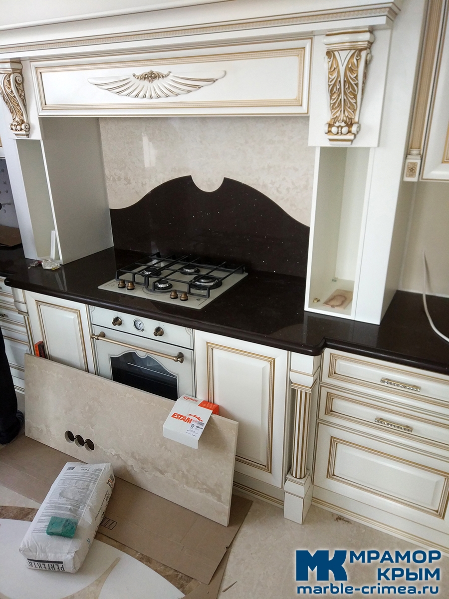 В нашем случае мы совместили использование мрамора и кварцевого агломерата методом инкрустации. В непосредственной близости к варочной поверхности расположен кварцевый агломерат. Выше - мрамор.
