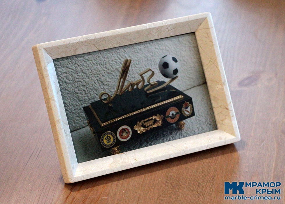Фото в рамке - это наша давняя работа, когда еще использовали пленочный фотоаппарат. Естественно, речь идет о каменных деталях, металл и сборку осуществляла ювелирная мастерская. Приз на турнир Лобановского 2008-го года в виде его росписи из металла и футбольного мяча из камня.